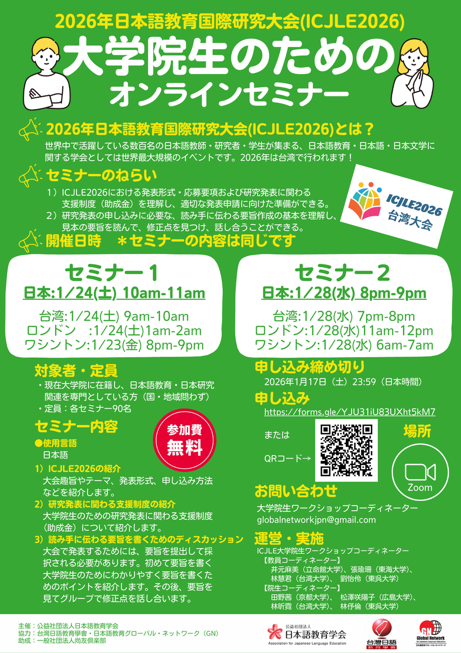 - 【参加者募集】2026年日本語教育国際研究大会参加準備「大学院生向けオンラインセミナー」(締切1/17)