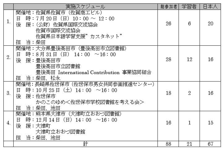 2025年7月から12月にかけて,九州地方の佐賀・大分・長崎・熊本の4県において,日本語教師,日本語学習者,自治体関係者などを対象に,「読む×話す×伝える!学習者と体験するレベル別日本語読書会ワークショップ」を開催しました。本研修会は,日本語教員である主催者に加え,図書館司書および学校司書の協力・支援を得て実施しました。